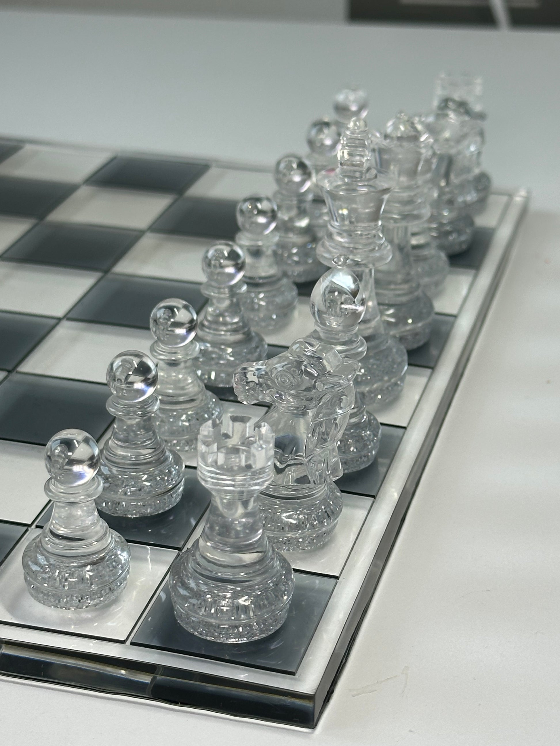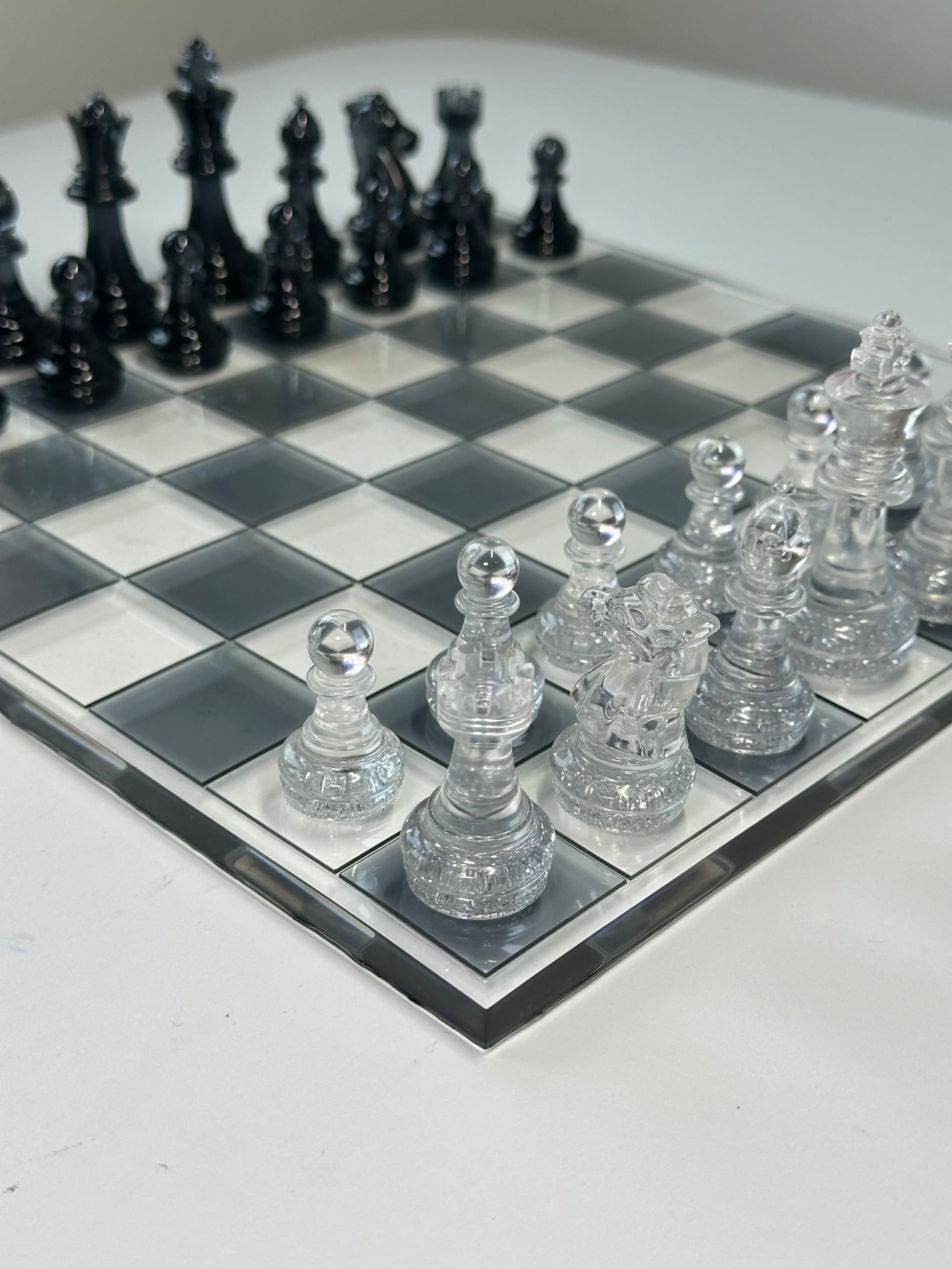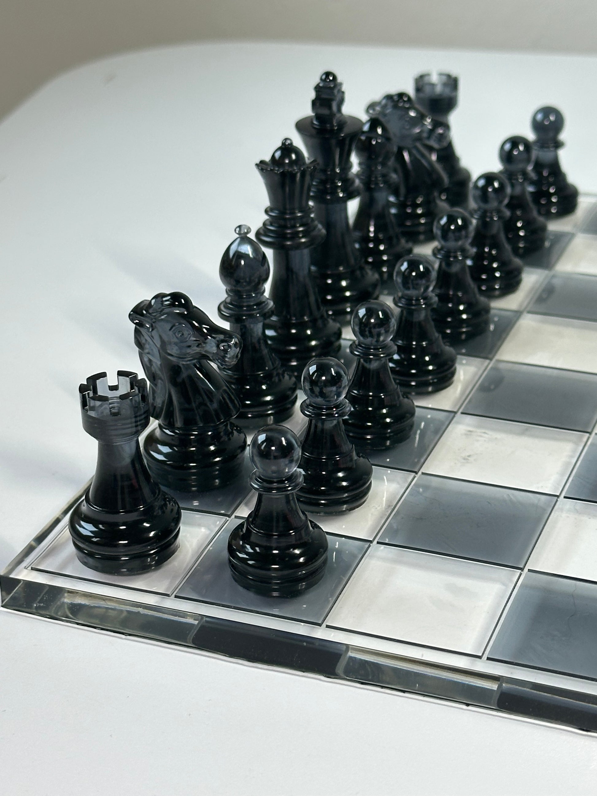 Questa scacchiera artigianale in resina unisce il contrasto deciso del nero alla purezza del trasparente, creando un oggetto elegante e moderno.