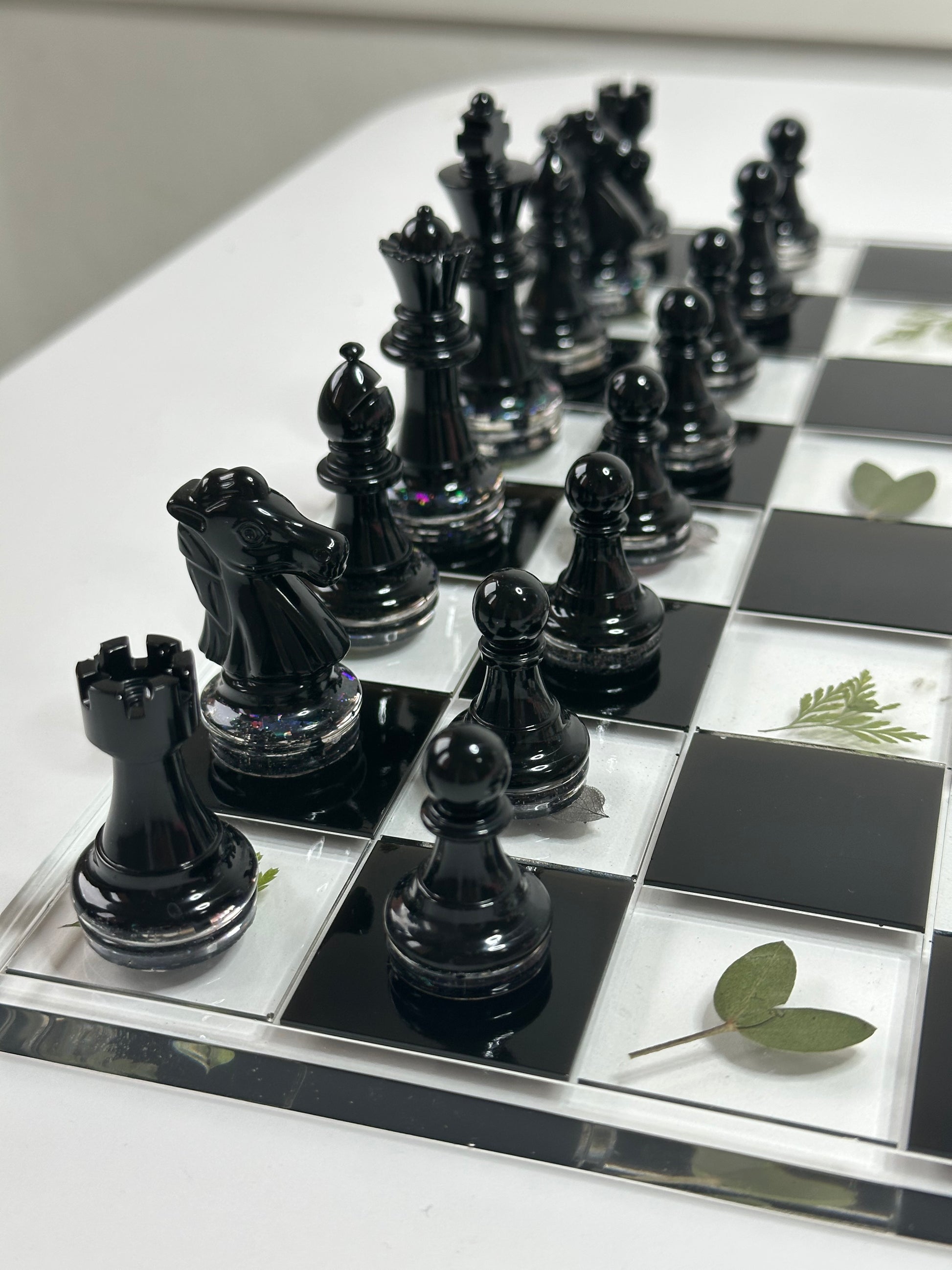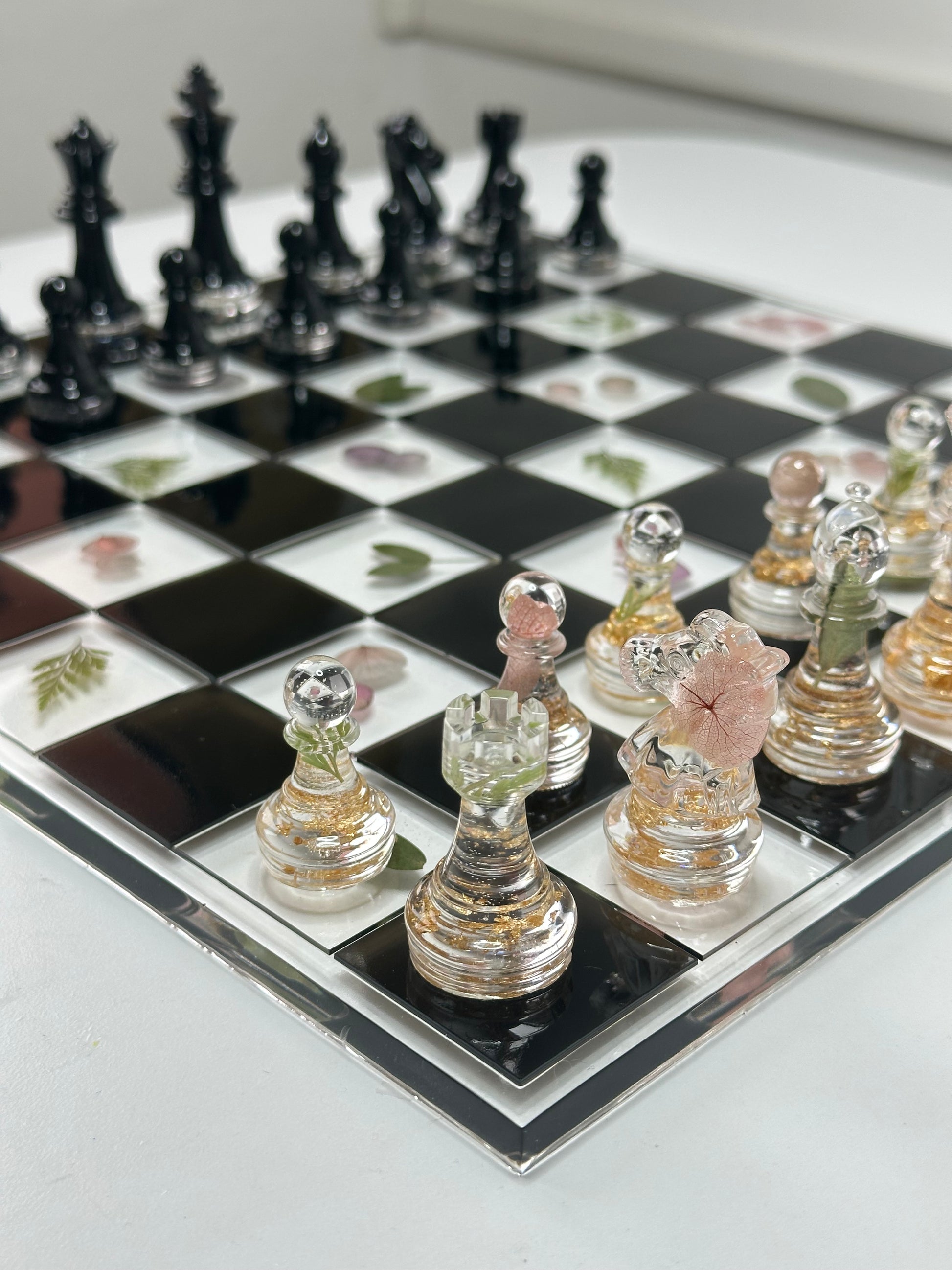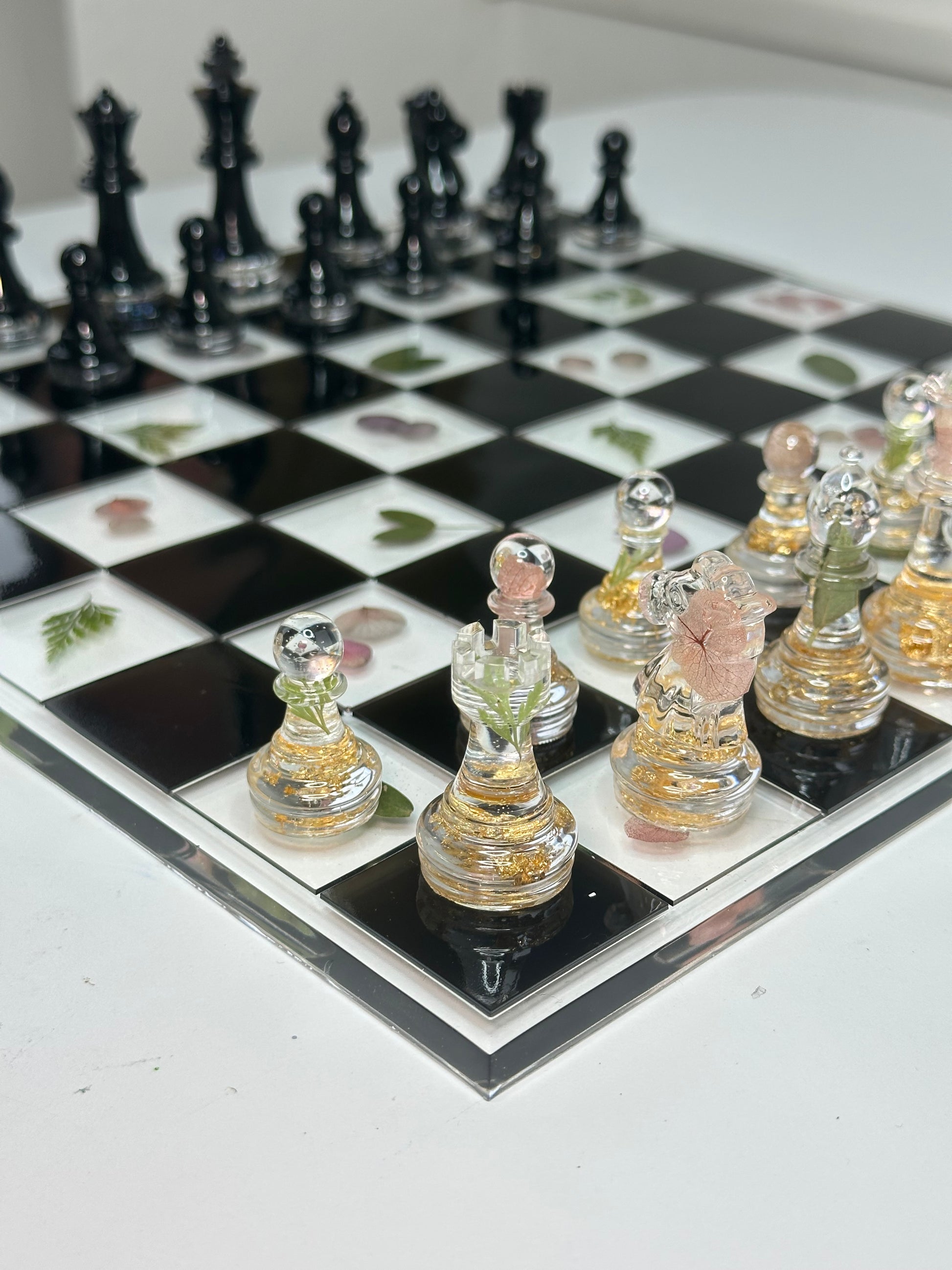 La trasparenza della resina esalta le forme e i colori naturali dei fiori, rendendo ogni pezzo unico e irripetibile, nessuna scacchiera sarà mai identica a un’altra, proprio come in natura.